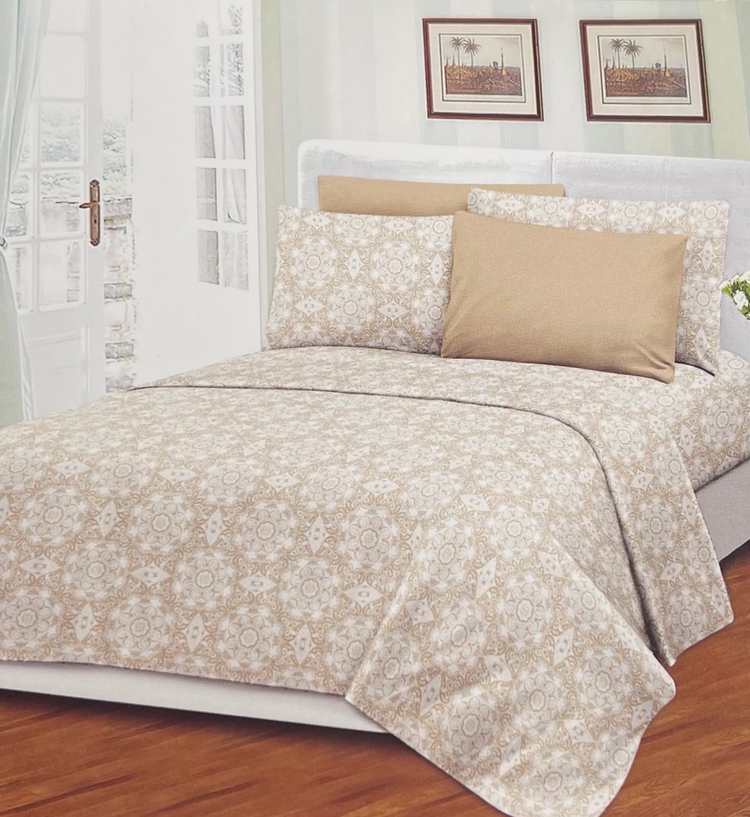 Our bedsheets are crafted from premium-quality fabrics chosen for comfort and durability. Some collections are made from 100% cotton, loved for its natural softness, breathability, and skin-friendliness. Others feature a cotton-poly blend for added strength, easy care, and wrinkle resistance- ideal for everyday use. All fabrics are gentle on the skin.